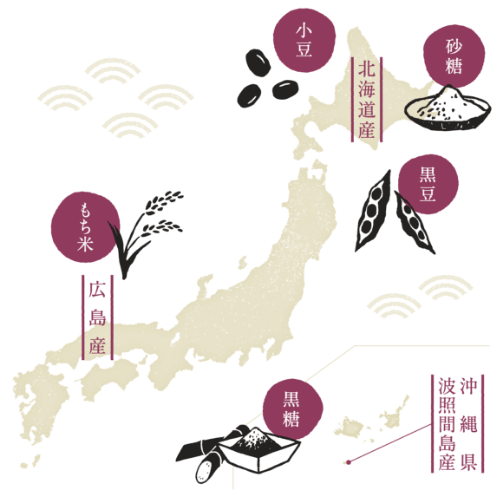 また、沖縄波照間島産の黒糖を100%使用した黒糖蜜を使用し、わらび餅などを製造。国産の糖質を積極的に使って和菓子を作ります。